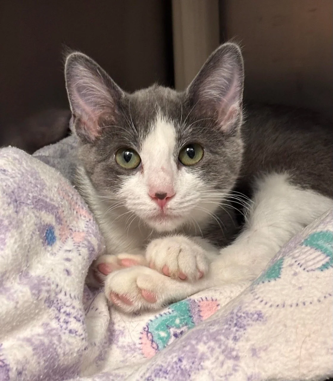 Eliza is a 4 month old spayed female Gray and White DSH. She is a very sweet kitty who came in a bit shy. But she has really adjusted quite well to Shelter life. Eliza loves to be held and cuddled but also enjoys exploring and playing.