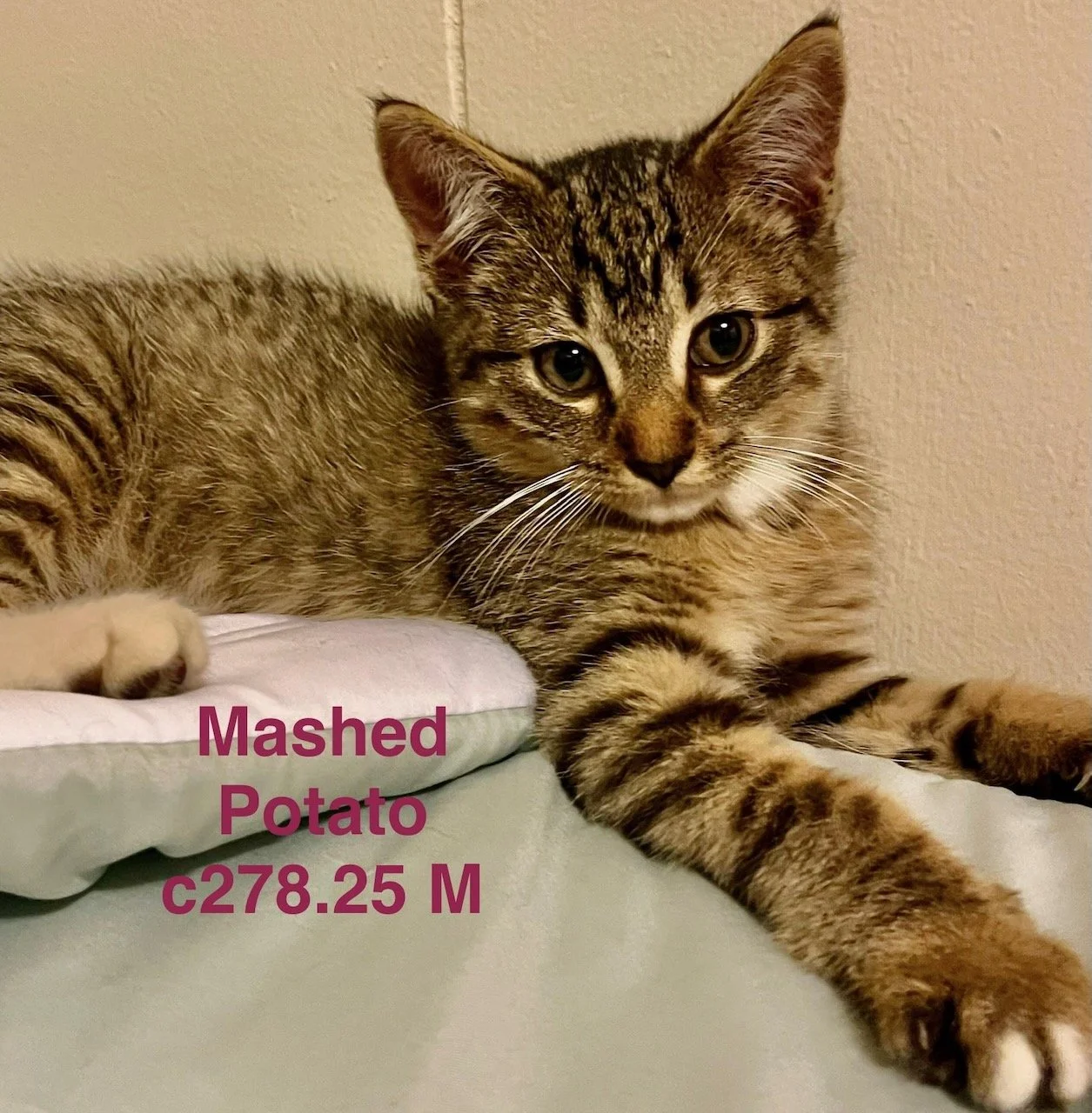 Adopted! Mashed Potato is a 3 month old neutered male Tiger DSH.