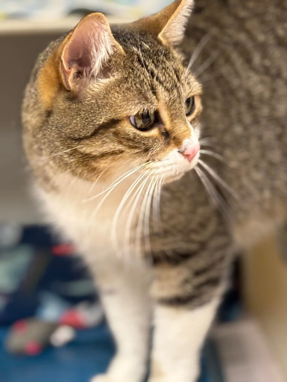 Meow is a 7 year old neutered male Tiger and White DSH. Meow is a handsome Bobtail kitty. He was originally adopted from us years ago but is back because his owner is ill and can no longer care for him. Meow is a very friendly and affectionate cat. He is very easy going and has adjusted to shelter life quite easily.