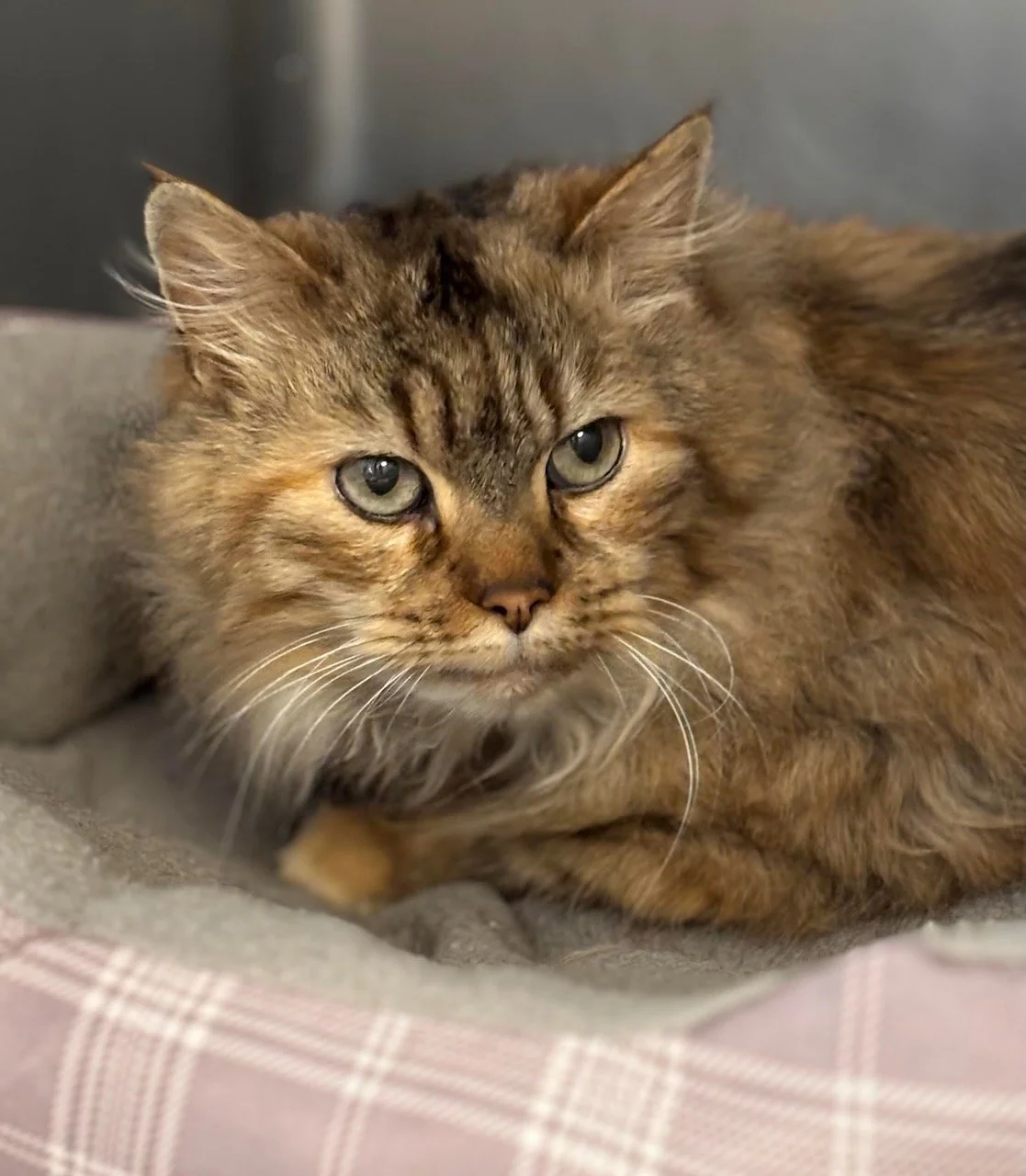 Sandy is an 8 year old spayed female Dilute Torby DLH. Sandy is a little shy at first but once you start petting her, she purrs and loves attention. She is said to be good with dogs.