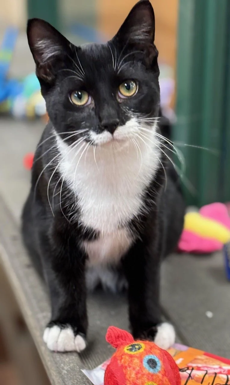 Turbo is a 6 month old neutered male Black and White DSH. Turbo is one of our foster kitties from the summer. He came back to us because he was bullying the other cats in the home. Turbo is just the sweetest lap cat - he is all about you but wants to be your one and only!