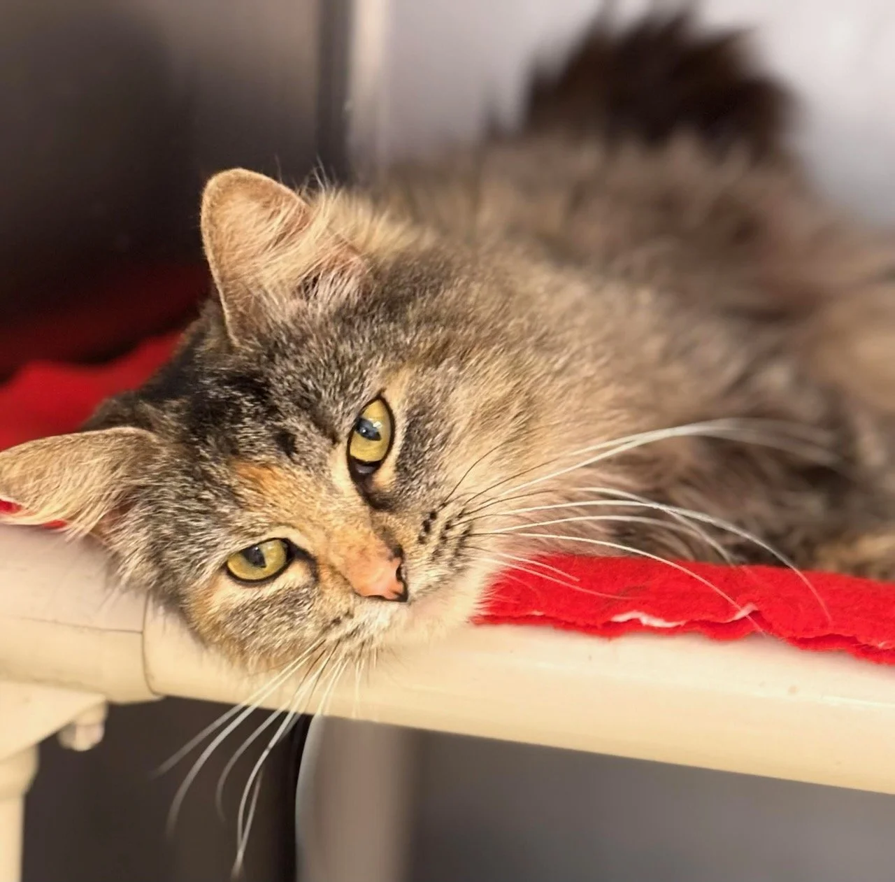 Delilah is a 3 year old female Torby DLH. She is a very friendly and sweet girl looking for a loving home. She is said to be good with children, dogs and other cats. She will be spayed prior to adoption.